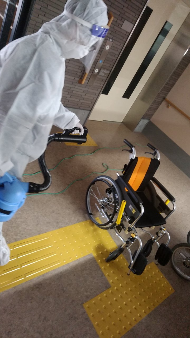 介護施設などでは、車椅子などの備品にもウイルス付着の要素があり、感染拡大する恐れがあります。しっかりと備品にも消毒と除菌をします。