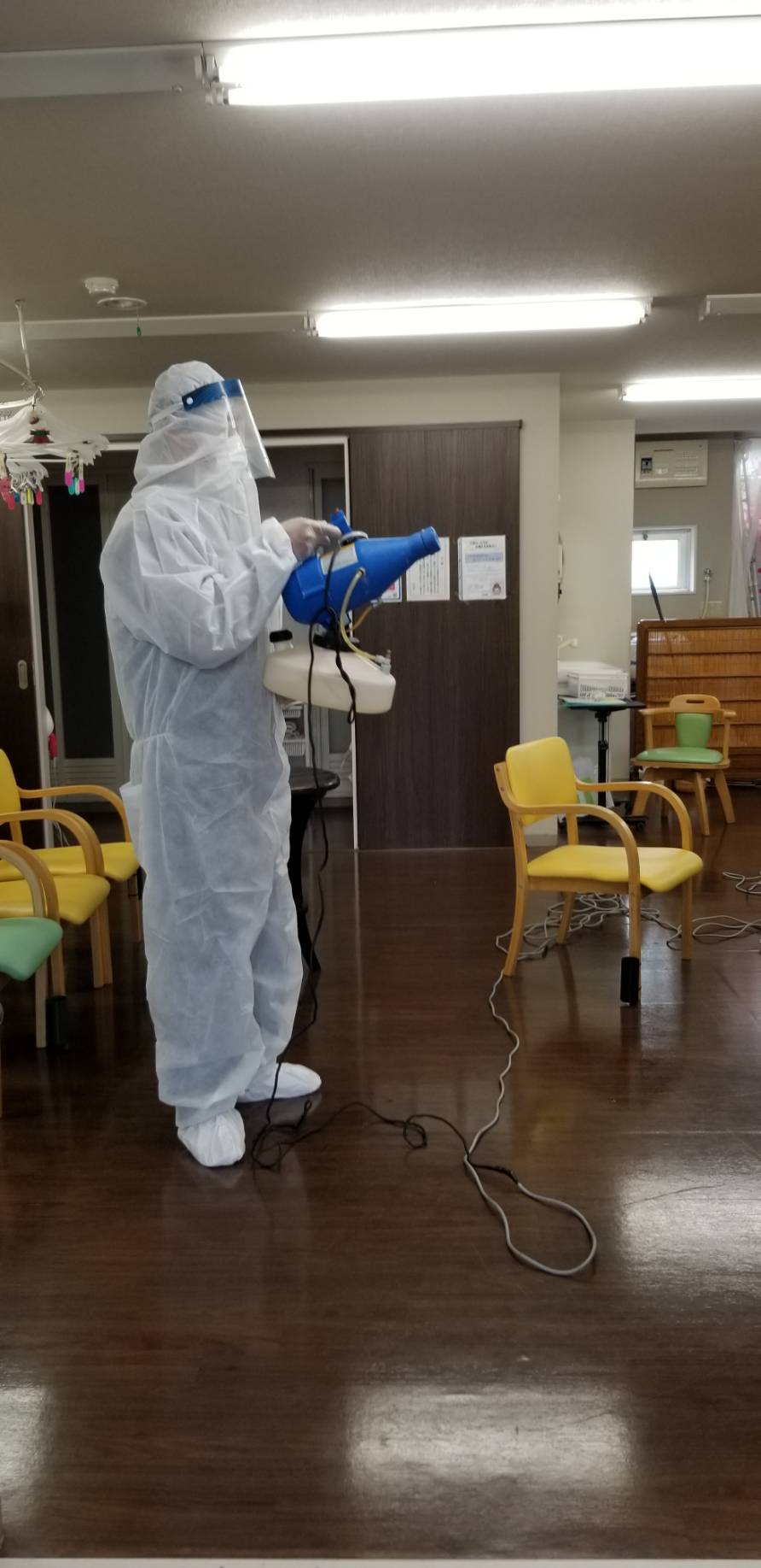 天井、壁面にも消毒薬品を吹き付け徹底除菌消毒