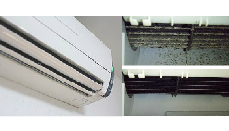 エアコンから黒い粉のようなものが降ってくる。エアコンをつけると始めに、カビのような腐った物のような臭がする。