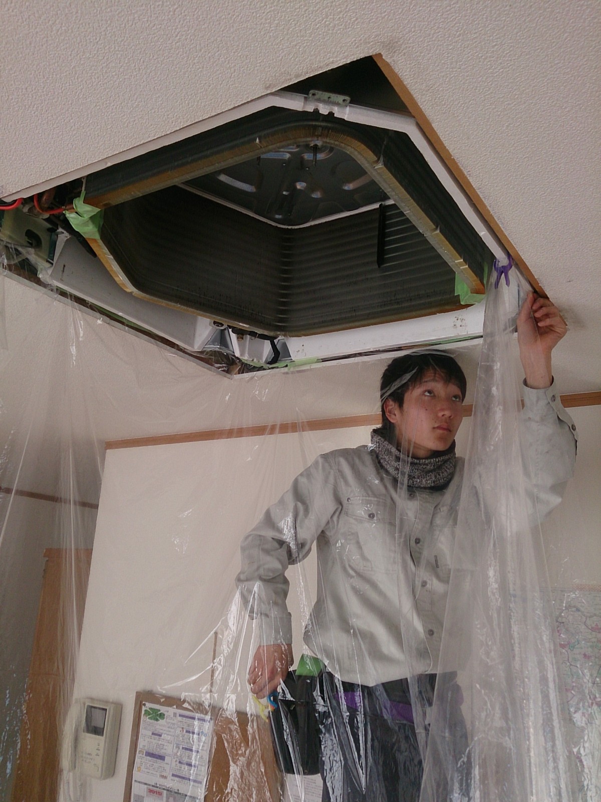 2)エアコンのカバー、フィルター、ルーバーを取り外し、本体の養生